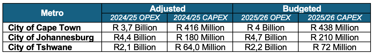 Municipal waste management operates at a scale of billions of rand annually. The table below illustrates the operational and capital expenditure of three metros, as per their recent Medium Term Revenue and Expenditure Framework.